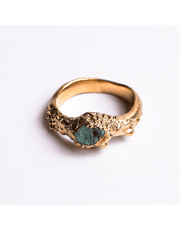 Gold plated, solid silver with a rough Emerald cast in place. With a satin finish.