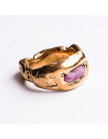 Gold plated, solid silver with a rough Emerald cast in place. With a satin finish.
